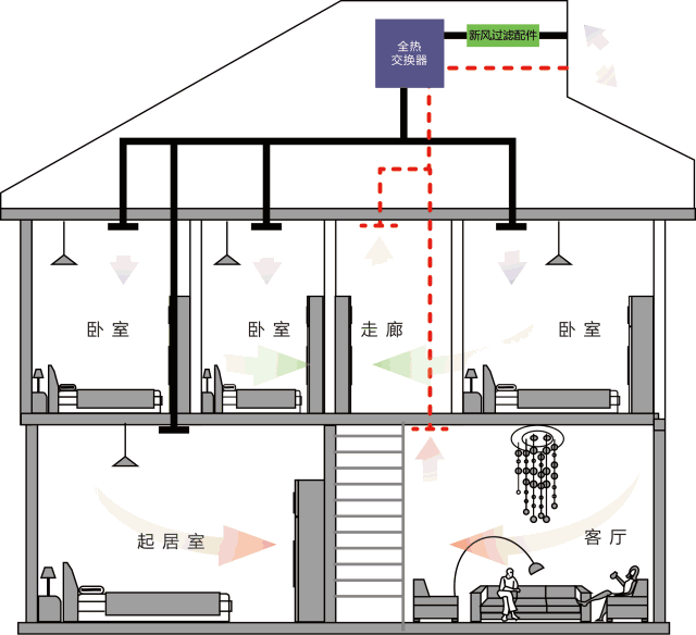 當(dāng)全熱交換器在夏季制冷期運(yùn)行時,新風(fēng)從排風(fēng)中獲得冷量,使溫度降低,同時被排風(fēng)干燥,使新風(fēng)濕度降低;在冬季運(yùn)行時,新風(fēng)從排風(fēng)中獲得熱量,使溫度升高,同時被排風(fēng)加濕。新風(fēng)換氣機(jī)是一種將室外新鮮氣體經(jīng)過過濾、凈化,熱交換處理后送進(jìn)室內(nèi),同時又將室內(nèi)受污染的有害氣體經(jīng)過過濾、凈化。